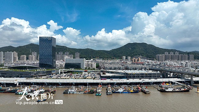 2023年8月20日,浙江省舟山市普陀区,满载梭子蟹的渔船正在舟山国际水产城码头卸货,船员们将一筐筐梭子蟹装车运往水产城内,经营户和工人们忙碌地按级分拣,准备销往各地市场。邹训永摄(人民图片网)