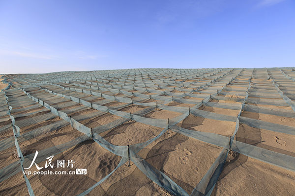 近年来,甘肃省酒泉市金塔县大力改善生态环境,采用科技治沙与人工治沙相结合,投入大量财力物力,实现了从“沙进人退”到“绿进沙退”的巨变。昔日的沙海变成了如今生机盎然的绿洲,肆虐的风沙被绿网牢牢锁住。马玉福摄(人民图片网)