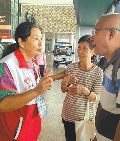 广州南站的每个角落唐伟都了然于心。她已经在这里服务超过13个年头,是志愿服务队里年纪最大的一名“银发”志愿者,人们亲切地称呼她为“唐姨”。