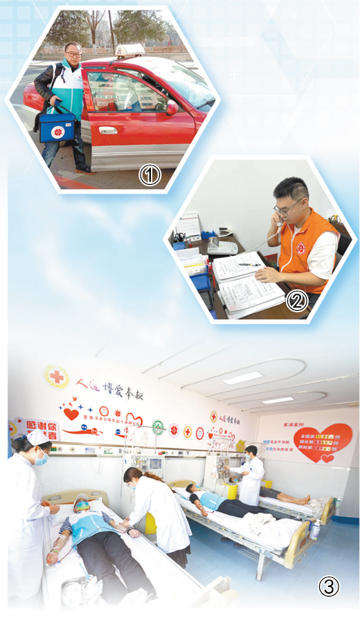 资料图片 图②:中华骨髓库工作人员在对志愿捐献者进行电话回访。 资料图片 图③:在湖北襄阳市中心医院造血干细胞采集室,3名志愿捐献者正在进行造血干细胞采集。 谢 勇摄(人民视觉) |
