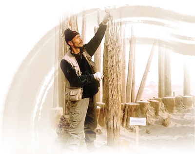 伊弟利斯在考古现场对一个胡杨立柱进行测量。