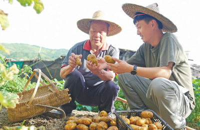 林燚炜(右)和李墩镇种粮大户查看土豆收获情况。