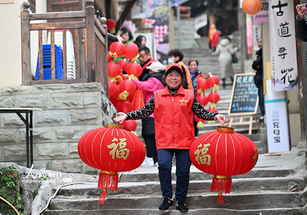 2024年1月25日,重庆市南岸区敦厚街社区党员志愿者在黄葛古道上挂灯笼、贴春联,喜迎新春。郭旭摄(人民图片网)