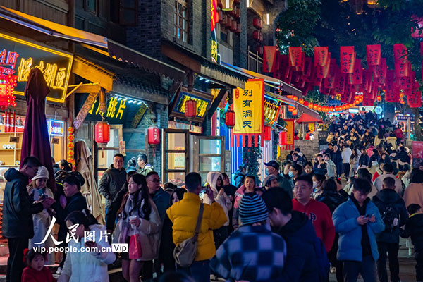 2024年2月5日,春节临近,重庆十八梯传统风貌区灯火璀璨,游客如织,旅游消费持续火爆。李洪波摄(人民图片网)