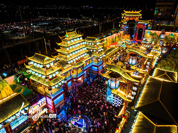 2024年2月16日,位于山东青岛城阳区的明月山海间,灯光璀璨,雍容的唐风搭配着“山海经”主题,让这座“不夜城”吸引了众多市民及游客前来观赏和游玩儿。杨雪梅摄(人民图片网)