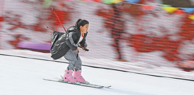 黑崖沟村滑雪场,一名小朋友正在滑雪。今年春节假期,每天都有3000多名游客来此游玩。
