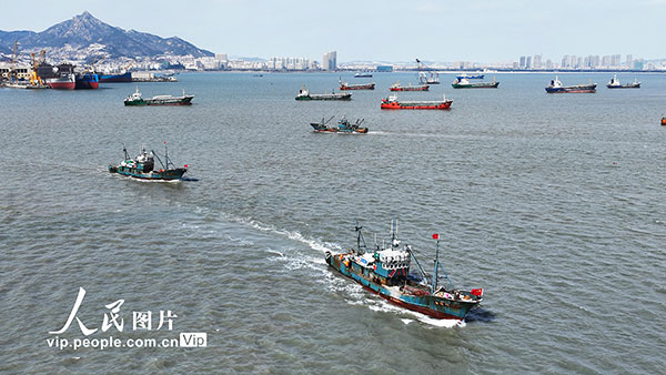2024年2月23日,在山东省荣成市石岛渔港,一艘艘渔船驶出渔港,前往捕捞海域捕捞鱼获。春节刚过,山东荣成的捕捞渔船就陆续开始出海捕捞,拉开春季捕捞大幕。张世松摄(人民图片网)
