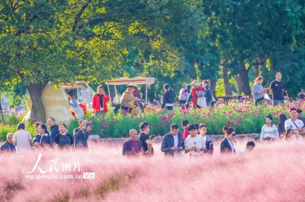 2024年10月1日,江苏省宿迁市湖滨新区三台山国家森林公园2220亩花海竞相绽放,百日草、硫华菊、醉蝶花、粉黛乱子草等各色花卉争奇斗艳,游人沉醉在色彩缤纷的花海中,尽享休闲生态游带来的快乐。陈少帅摄(人民图片网)