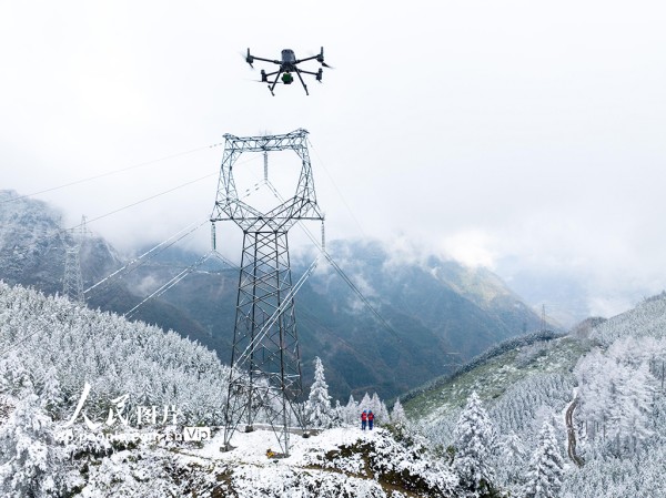 受强降温影响,四川绵阳山区近日迎来降雪。为确保电网安全稳定运行,国家电网四川电力(绵阳)连心桥共产党员服务队迅速行动,前往北川县擂鼓镇。他们利用无人机和红外测温仪等先进设备,对易产生低温覆冰的220千伏东曲线进行雪后特巡,全力保障当地电网的安全运行。田海摄(人民图片网)