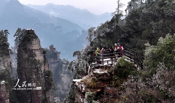 2024年12月11日,湖南张家界国家森林公园迎来了降雪。在黄石寨景区,云雾缭绕、雾凇晶莹、冰挂剔透,三者交相辉映,吸引了众多游客前来观赏。吴勇兵摄(人民图片网)