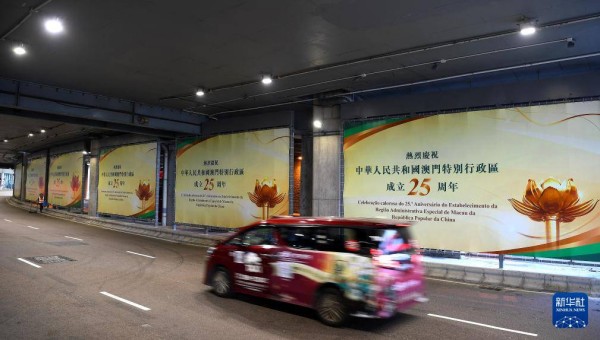 12月17日,车辆从庆祝澳门回归祖国25周年横幅旁驶过。