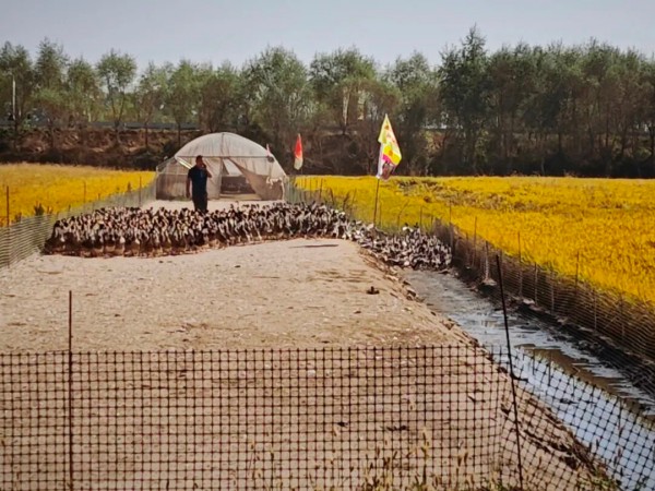 活动现场气氛热烈,商户们热情地向市民和游客推介本地特色农产品,甜香清脆的苹果、鲜活肥美的河蟹、鲜香软糯的大米以及做工精湛的手工艺品琳琅满目,吸引众人驻足品尝、咨询购买。舞台区特色歌舞表演轮番上演,引来观众阵阵掌声。在稻田基地,连片稻田泛起金黄,稻穗饱满,秋风拂过,稻浪层层。一群训练有素的鸭子在养殖户的指挥下,整齐有序地进入稻田,形成一道生动有趣的田园风景。