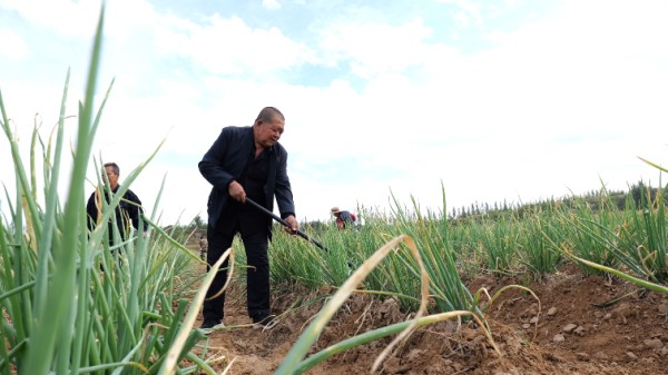 上榆泉村党支部书记王振刚介绍:“过去人们种的是3亩、2亩,它比较单一,现在通过村合作社,统一是公司+农户模式,农户在这里种,都是成片的,100多亩,在这里还有其他收益。通过这样,老百姓不离家门口就能稳定就业,一年也能增收5000—6000元。今年这个葱长得挺好,也能达到20多公分,现在销路也不愁,县里有订单合作,我们主要是把这个红葱种起来种好,其他交给公司,老百姓风险就更小了,他们有价格补贴、保险,种红葱也就积极性更高了,这个红葱就是老百姓的‘金疙瘩’‘金宝贝’。”