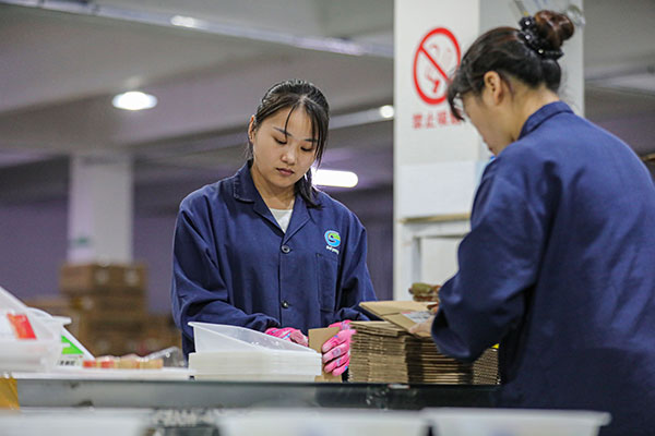 10月10日,广西桂林市灵川县定江镇,生产线上工人正在打包作业。阳海翔 摄