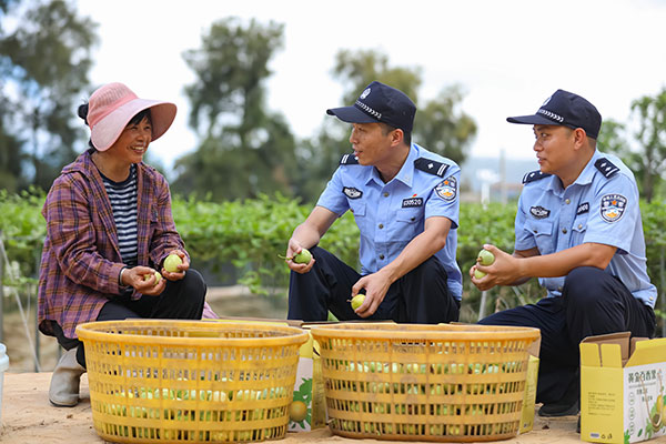 9月17日,福建省平潭综合实验区中楼乡大坪村,百亩百香果园迎来丰收季,平潭综合实验区公安局君山支队社区警务大队组织民警深入辖区,开展治安巡逻、防范电信网络诈骗宣传等“果园警务”工作,积极做好助农、护农、安农工作,帮助果农守护“钱袋子”,全力护航“甜蜜经济”安全,助力乡村振兴和果农增收致富。谢贵明 摄