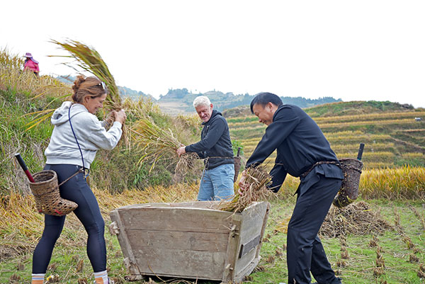10月26日,在广西桂林市龙胜各族自治县平安壮寨,来自比利时的游客在体验打谷子。