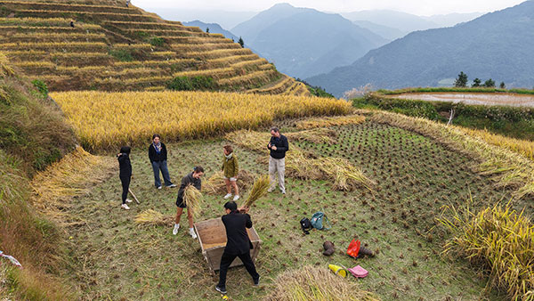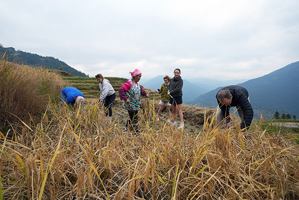10月26日,在广西桂林市龙胜各族自治县平安壮寨,来自比利时的游客在体验收割稻谷。