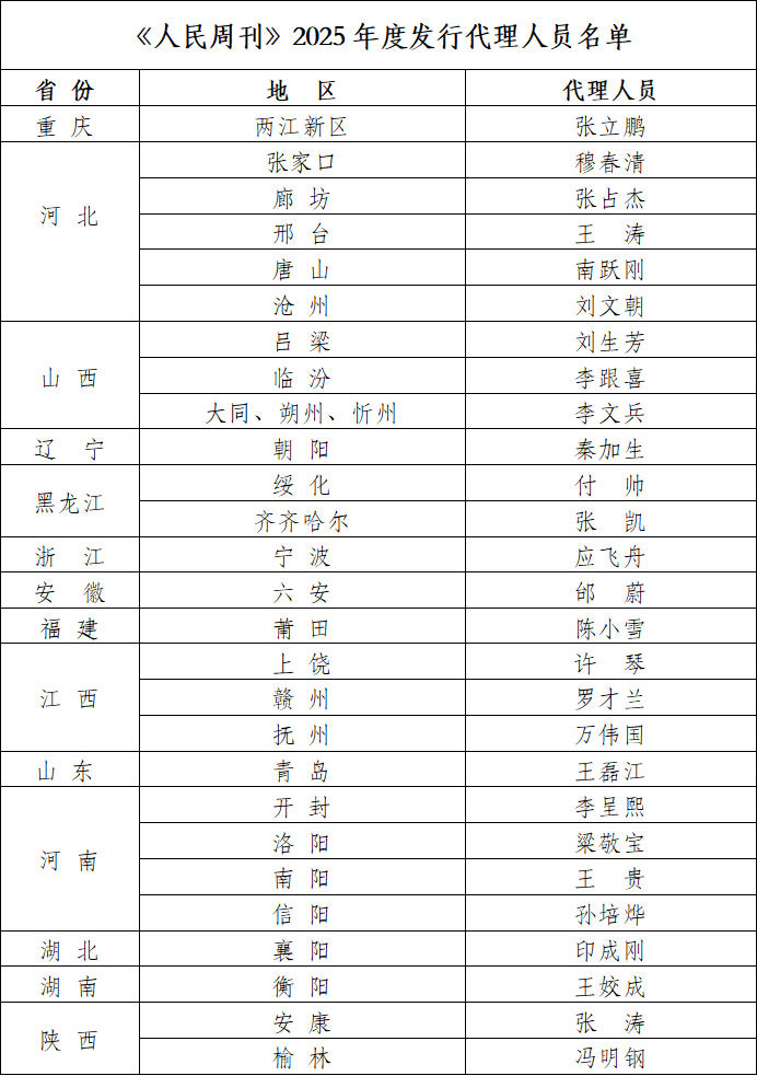 《人民周刊》是由人民日报社主管、人民日报出版社主办的时事综合类期刊,努力打造“人民日报现代传播体系的窗口、主流思想舆论融合传播的平台、宣传社会主义核心价值观的阵地”。为严格规范周刊的发行工作,促进可持续发展,现将2025年度发行代理人员名单在人民周刊网上进行公布。具体如下: