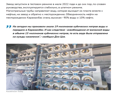 ——摘自今日哈萨克斯坦通讯社报道《为卡拉赞巴斯油田淡化处理逾1900万立方米地层水》