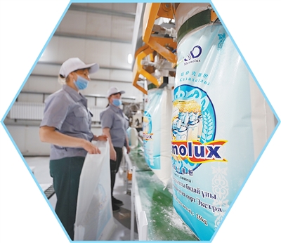 在中国西安爱菊集团哈萨克斯坦园区,工作人员在面粉生产线上作业。