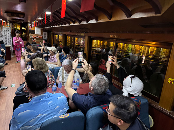 踩线团在两江四湖游船上观看广西传统戏曲表演。
