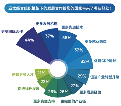 亚太地区占世界人口1/3,占世界经济总量逾六成、贸易总量近一半,是全球经济最具活力的增长带。作为建设开放型世界经济的先驱,亚太经合组织诞生30多年来,已逐步发展为亚太地区层级最高、领域最广、最具影响力的经济合作机制,为提升区域经济一体化水平、引领经济全球化发挥了重要作用。报告显示,85%的受访者认可亚太经合组织对推动地区经济发展、社会进步和民生改善所发挥的积极作用,超过八成受访者认为本国受益于亚太经合组织框架下的发展合作,包括获得“更多国际合作”(44%)、“更多发展机遇”(37%)和“更多先进技术”(35%)。