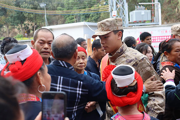 在三排镇油岭村,身着崭新军装、胸戴鲜艳红花的新兵们精神抖擞。油岭村村民身穿瑶族服装,通过跳长鼓舞等隆重的方式送别新兵们。