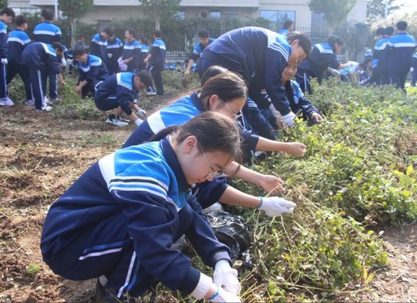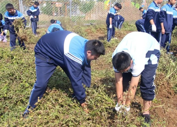 10月30日,南阳市第十完全学校高中部的后稷果蔬园内一片欢声笑语,高一、高二的同学们有条不紊地开展花生采摘活动,用双手收获四个月前播种的喜悦。