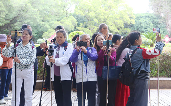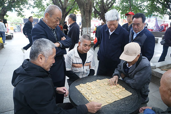 老年人在公园里弹唱歌曲。王钰、骆坚忠 摄