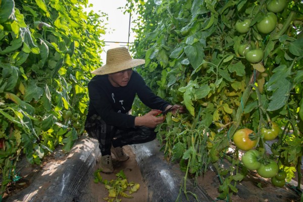 在大同市云冈区晋龙生态园宝丰大棚采摘区内,一串串色泽鲜亮、饱满圆润的西红柿挂满枝头,红如玛瑙、艳似丹霞,空气中弥漫着清甜果香。种植户范晓权望着满园丰收的景象,脸上洋溢着掩饰不住的喜悦,双手不停地采摘、分拣,忙碌的身影穿梭在绿意盎然的大棚间,勾勒出一幅生动的丰收画卷。