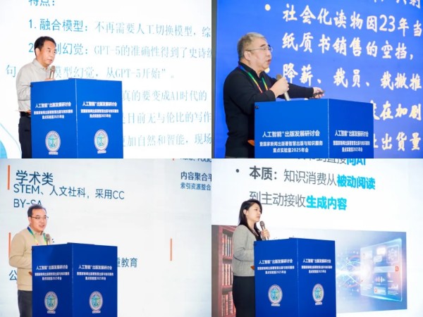 主旨报告环节由来自高校、出版机构和行业单位的4位嘉宾作主旨报告。北京师范大学出版集团副总经理姜钰以《人工智能视域下中小学数字教材的实践省思与进路展望》为题,从数字教材审定、教学应用与产业生态构建等方面,探讨人工智能对教育出版体系带来的深刻影响。中共重庆市委当代党员杂志社总编辑张倵瑃在题为《人工智能+驱动出版产业转型升级》的报告中指出,人工智能正从技术、知识与生态层面推动智慧出版由业务协同迈向价值共生。中华医学会杂志社党总支书记、社长、总经理、总编辑魏均民围绕《展望数智赋能 大力提升科技期刊服务能力》,介绍了期刊知识中台与知识服务建设,并分享了大数据重构产业发展逻辑的思考。广东省出版集团数字出版公司总经理梁磊以《人工智能是挽救出版业的药吗?》为题,结合教育出版实践,提出了对人工智能影响出版业的反思性观点。河北领先文化传播有限公司副总经理兼总编辑孔庆义、南京大学纪委原副书记江莹、江苏凤凰出版传媒股份有限公司融合发展部副主任蔡立、北京北大方正电子有限公司产品总经理高国连等分别主持了相关报告。