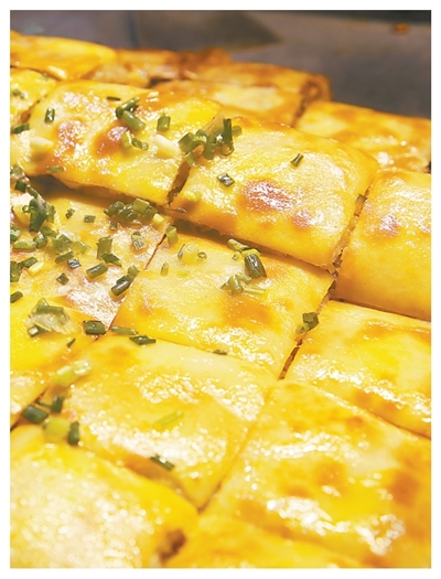 除了吃面嗍粉,在鱼米之乡“过早”自然少不了“米”的身影。在户部巷的许多店铺里,总能见到一口大铁锅,里头整齐码放着方方正正的豆皮,鲜亮的金黄色一瞬间便能攫住食客的目光。这里豆皮的皮不是小麦粉制作的,而是将大米和黄豆、绿豆按一定比例调配、打浆,在大锅上摊成薄饼、淋上金黄鸡蛋液而成。豆皮上再铺一层糯米、一层肉丁、香菇、笋尖等混合调配的馅料,小火煎熟后,便可呈现层层叠叠的丰富口感。