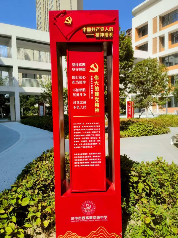 苍翠树木、茵茵碧草间,一排醒目的红色宣传柱巍然挺立。转动柱子中间的牌匾,建党精神、延安精神、太行精神、雷锋精神、南泥湾精神、西迁精神等中国共产党人的精神谱系内容一一展示,成为校园广场的视觉焦点。近日,陕西省汉中市西高新初级中学精神谱系广场正式亮相,成为师生们的“开学第一课”。