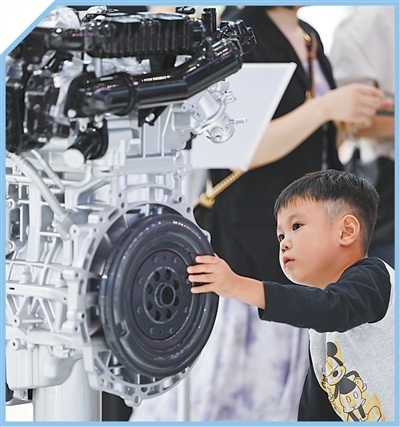 智能网联新能源汽车展区,小朋友在观察汽车发动机。