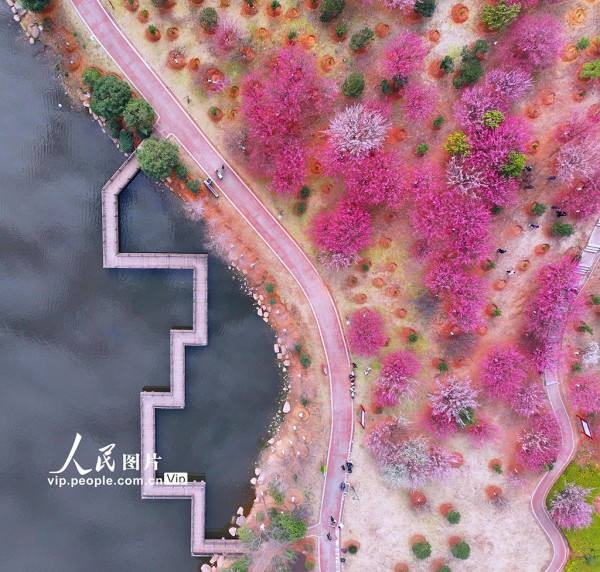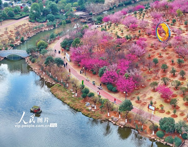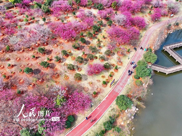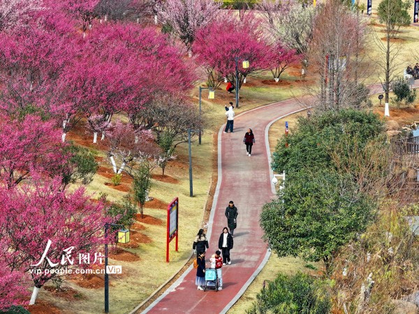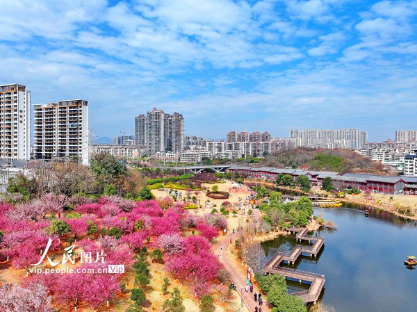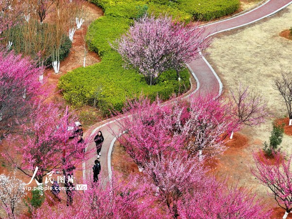 2025年1月31日,江西省赣州经开区金凤梅园内红梅竞相绽放,吸引了游客前来打卡赏梅。城市建筑与湿地景观交相辉映,构成了一幅美不胜收、令人心旷神怡的画卷。朱海鹏摄(人民图片网)