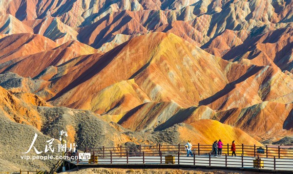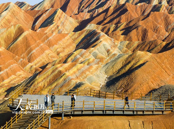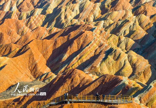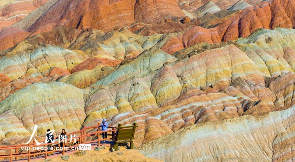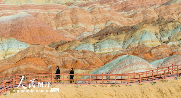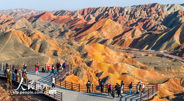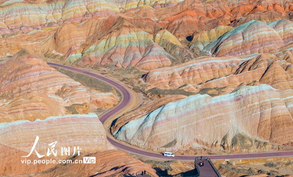 2025年3月15日,在甘肃省张掖七彩丹霞旅游景区,车辆穿梭于如画景致之中,游客漫步于斑斓画卷之间,这里独特的地貌奇观吸引着来自四面八方的游客。杨潇摄(人民图片网)