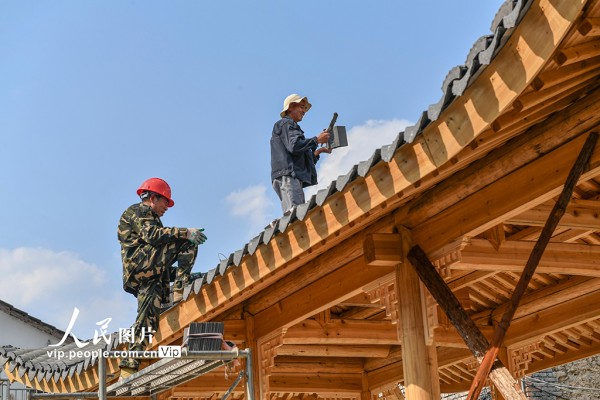 2025年5月11日,浙江省台州市仙居县皤滩乡山下村,施工人员正在修缮传统凉亭。该村落现存古宅、古道、古戏台、古河道、古盐铺、古树群、古井群等传统建筑及遗存共12处,构成完整的传统聚落景观体系。
