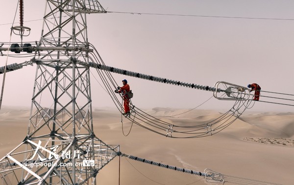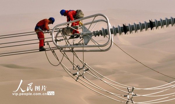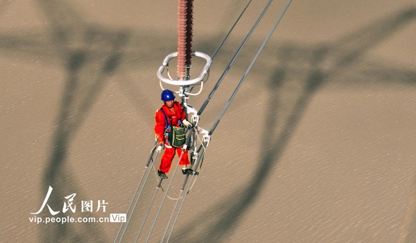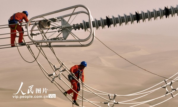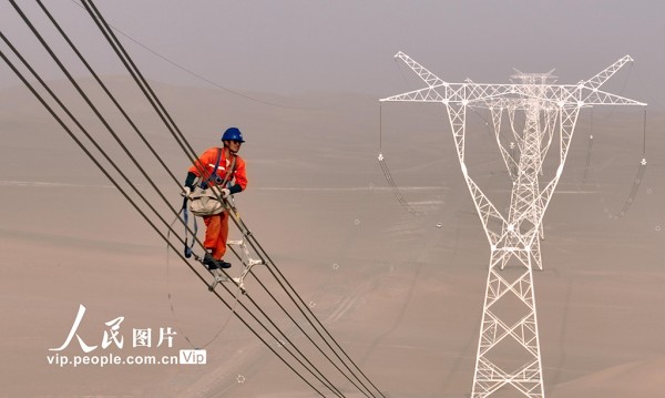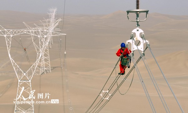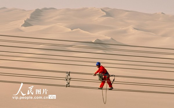 2025年8月7日、8日,新疆塔克拉玛干沙漠,电力工人在民丰-且末-若羌750千伏输电线路上进行消缺作业。马元摄(人民图片网)