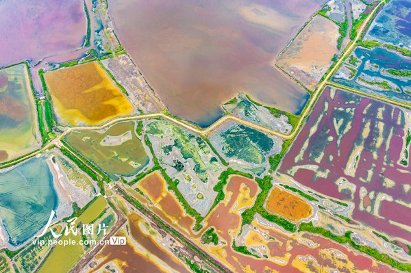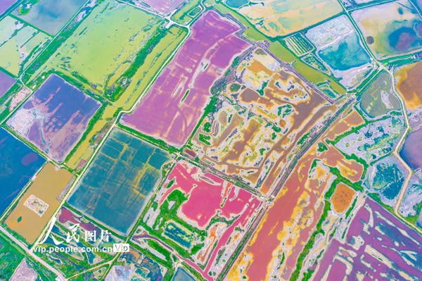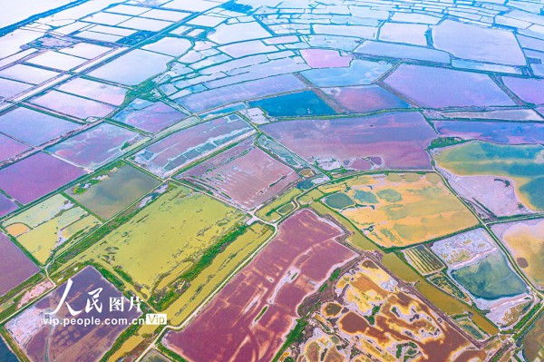 2025年9月2日,山西省运城盐湖呈现出色彩斑斓的景象。