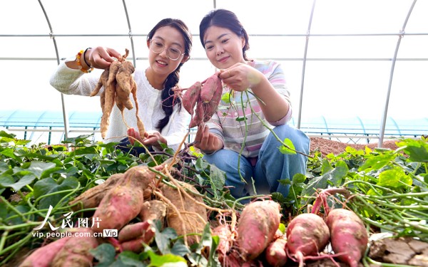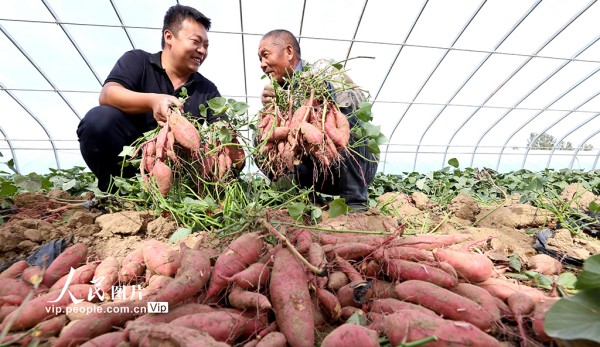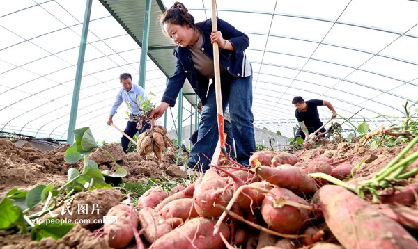 金秋时节,甘肃省张掖市临泽县平川镇三二村种植农户试种的“烟薯”“金海3号甜”“红天使”等12个优质蜜薯品种,进入成熟采挖季,每亩收获蜜薯在3吨以上,喜获丰收。王将摄(人民图片网)