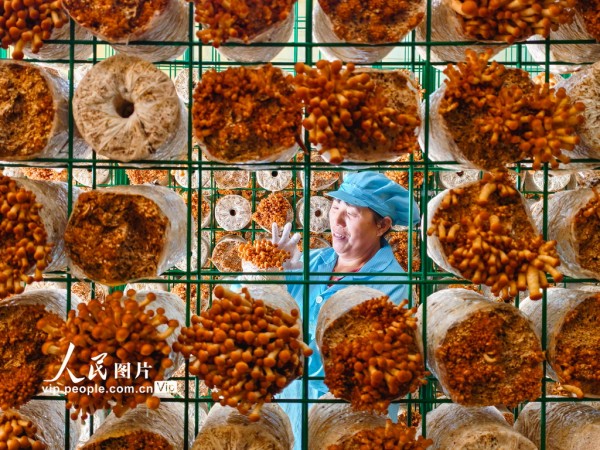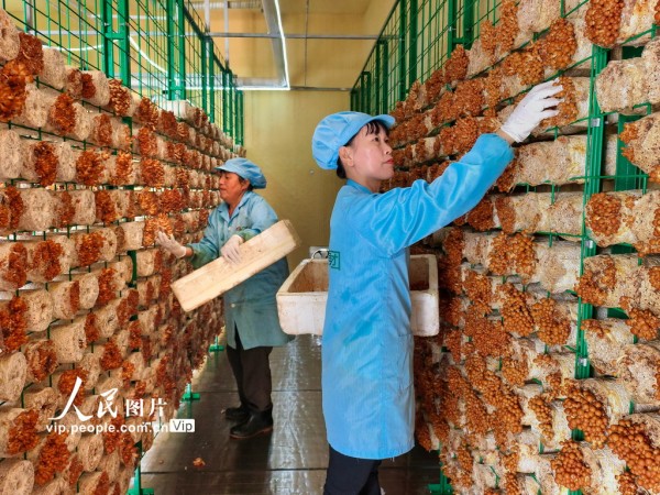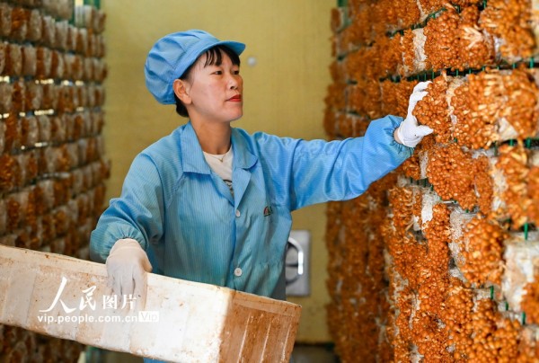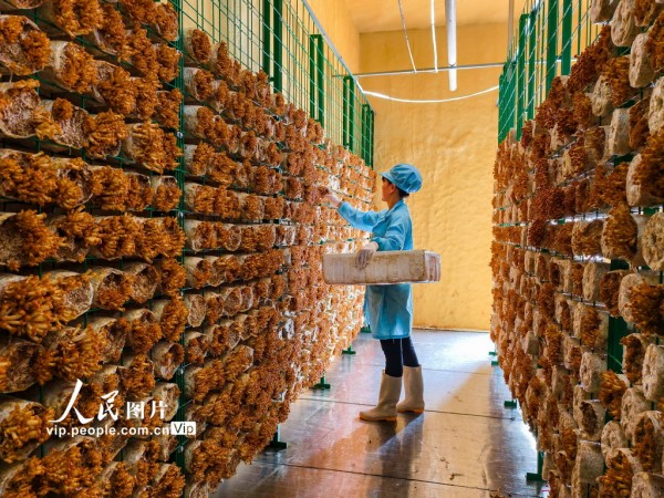 近日,湖北省安陆市孛畈镇长松食用菌产业园的员工在种植园内采摘香菇,供应市场。胡学军摄(人民图片网)