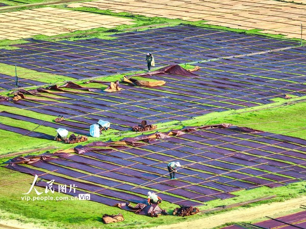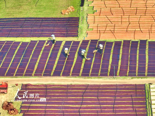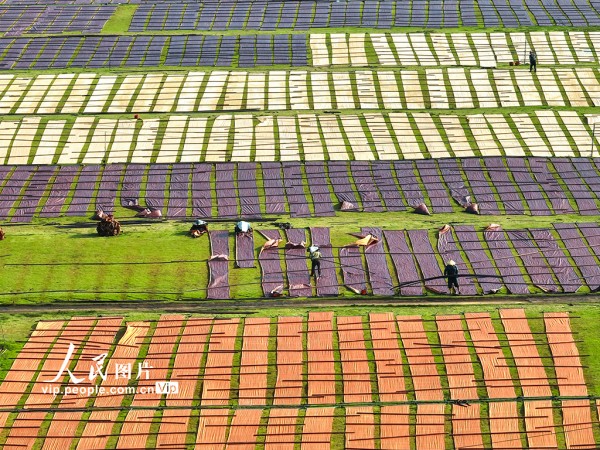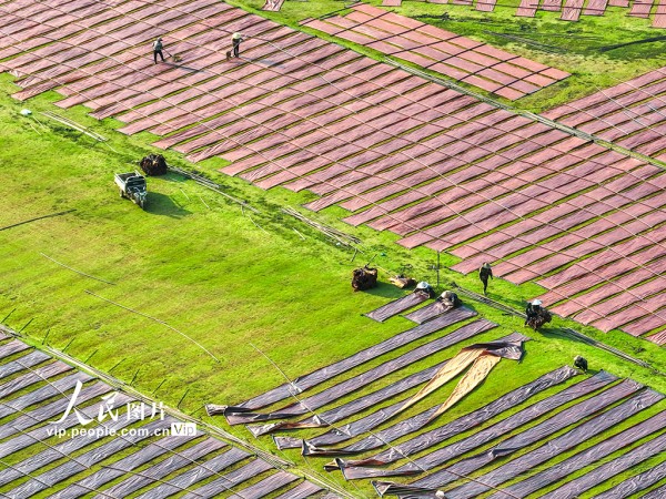 2025年10月12日,在广西梧州市蒙山县蒙山镇的一家丝绸企业晒场内,工人们趁天气晴朗,忙着翻晒、卷收香云纱。