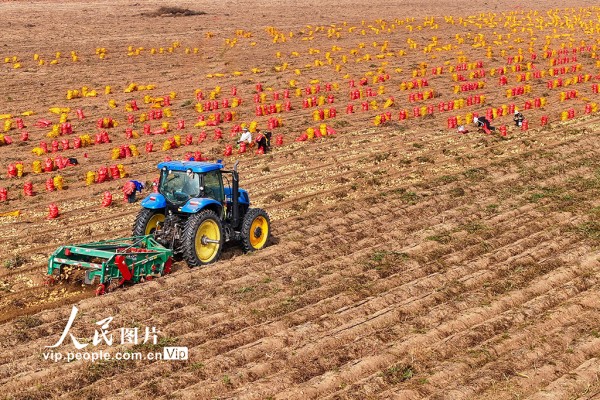 2025年10月14日,内蒙古鄂尔多斯市达拉特旗王爱召镇南红桥村的农民正在采收马铃薯。
