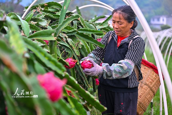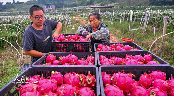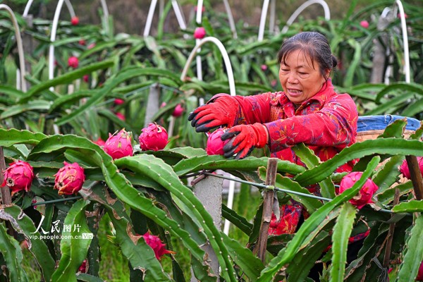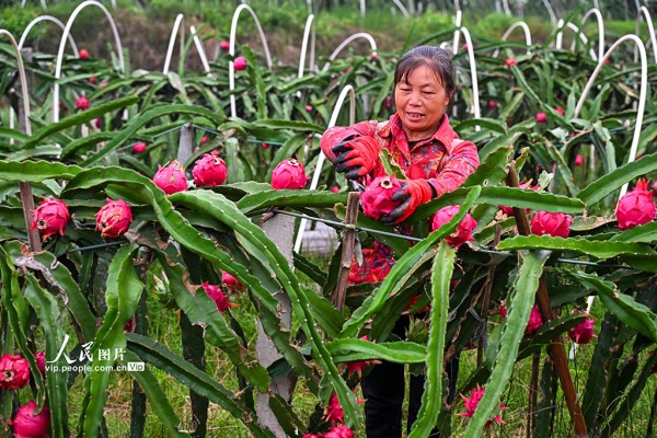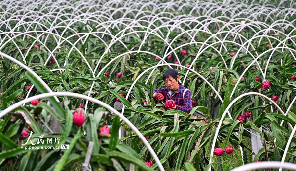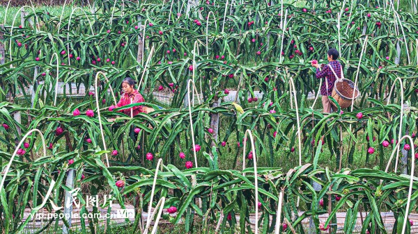 近年来,当地因地制宜规模化发展火龙果、樱桃等特色水果产业,助力土地增效,村民增收。潘帅摄(人民图片网)