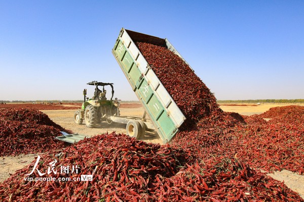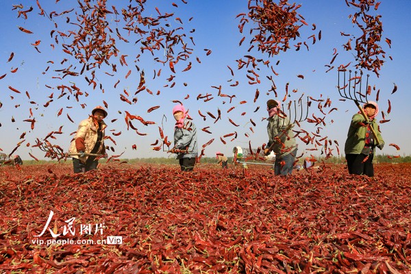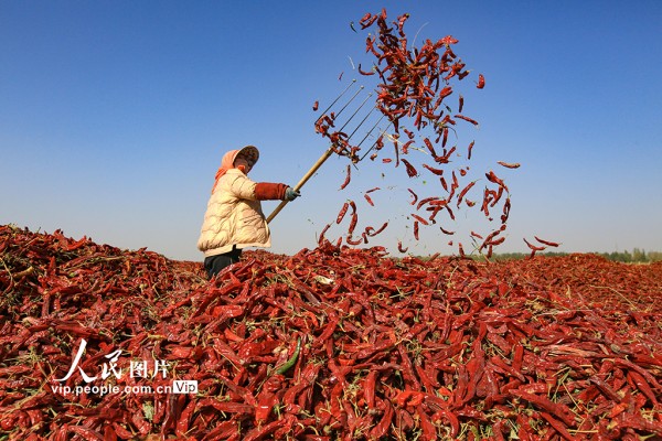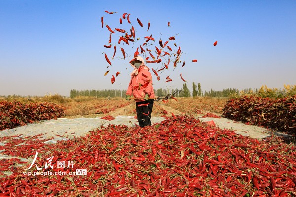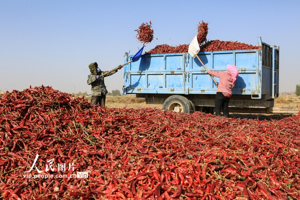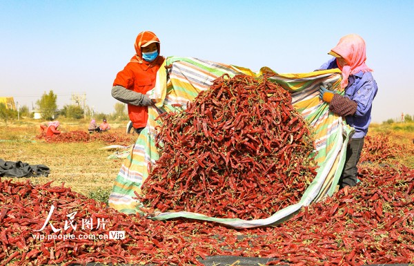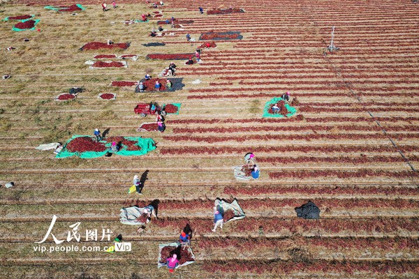 2025年10月19日,甘肃省嘉峪关市新城镇新城村辣椒种植基地,农民忙着采摘、晾晒辣椒。马玉福摄(人民图片网)