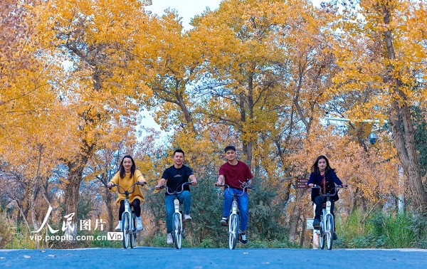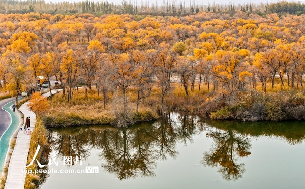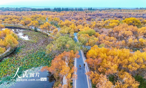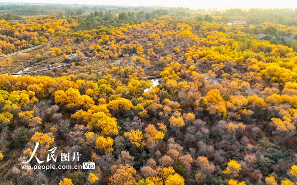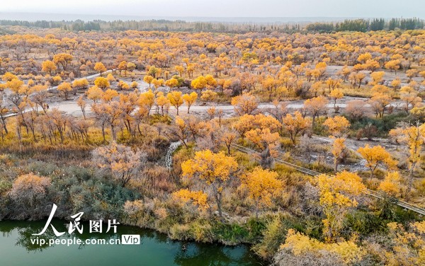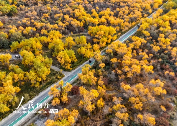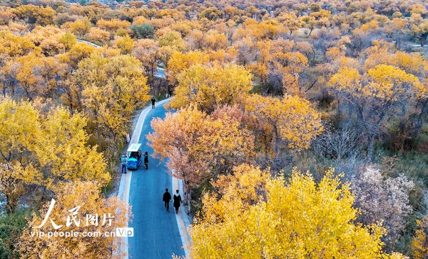 2025年10月19日,新疆泽普县金湖杨国家森林公园,胡杨林渐渐泛黄,秋意渐浓,吸引不少游客前来。张进刚摄(人民图片网)