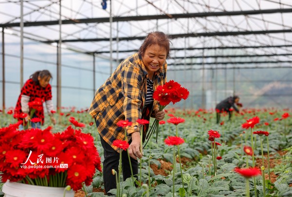 时下,位于贵州省铜仁市玉屏侗族自治县朱家场镇茅坡村种植的非洲菊竞相绽放,村民们抓紧采收,供应市场。