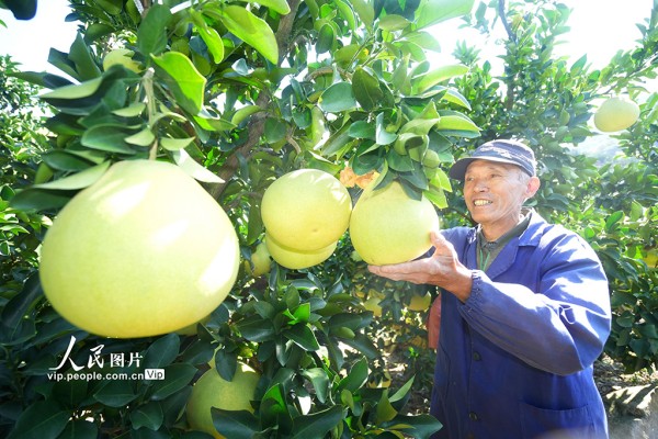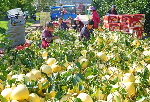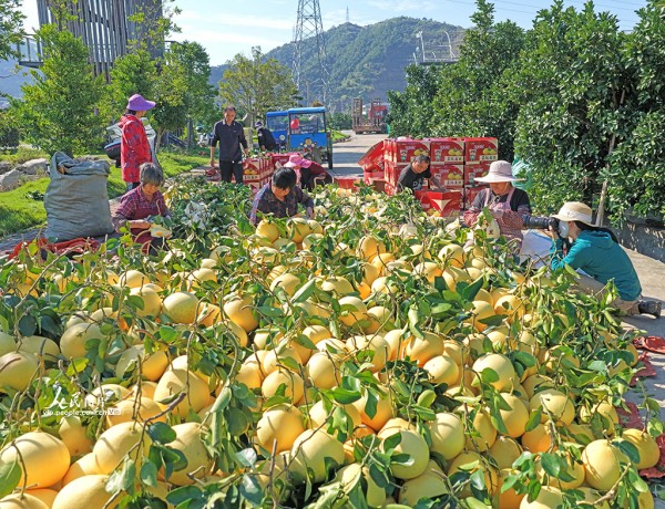 2025年10月23日,在浙江省玉环市清港镇文旦柚子种植基地,种植户们正忙着采摘、分拣、装运文旦柚。段俊利摄(人民图片网)