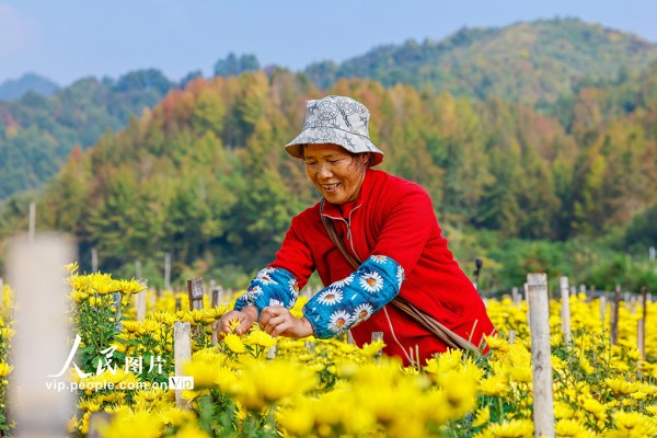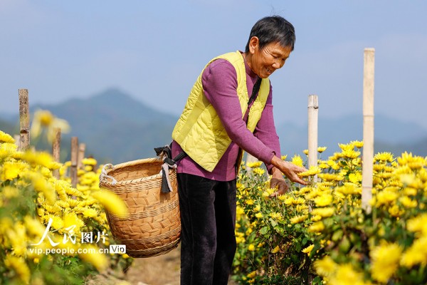 金秋时节,安徽省黄山市歙县溪头镇千亩金丝皇菊陆续进入采摘期,农民们趁着晴好天气采摘菊花,确保丰产丰收。施亚磊摄(人民图片网)