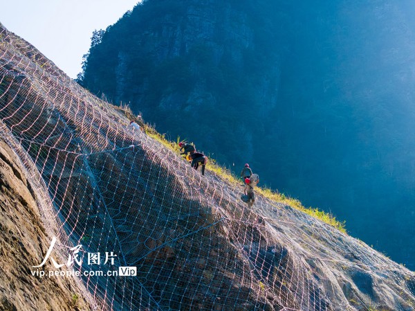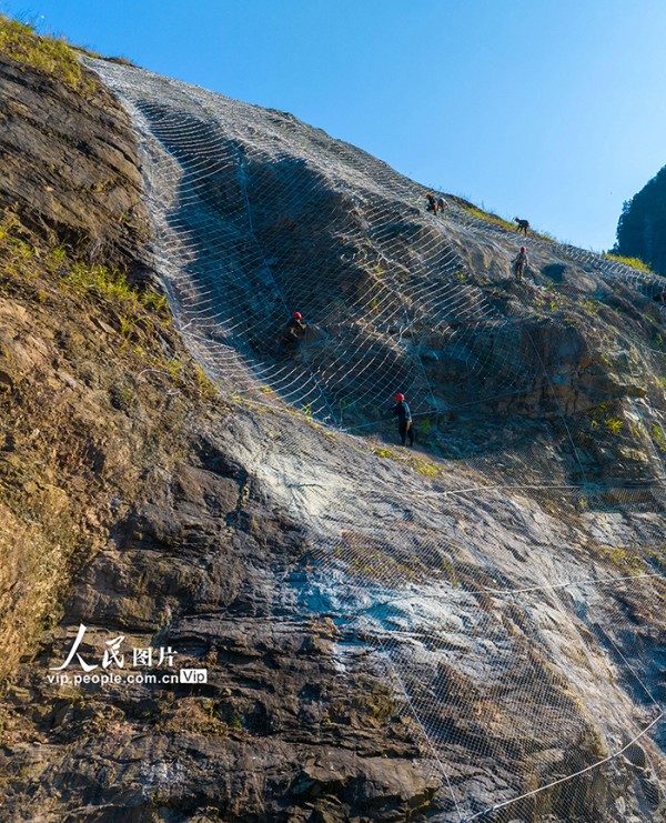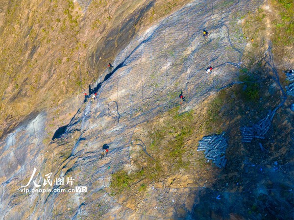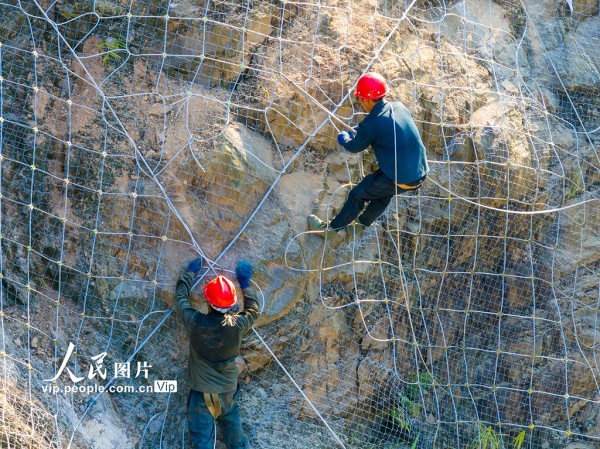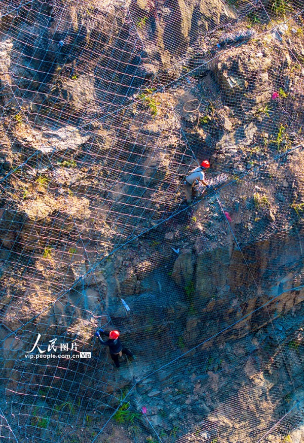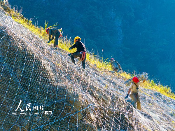 2025年10月28日,在广西来宾市金秀瑶族自治县忠良乡永和村,工人正在为金秀至蒙山公路石壁路段边坡安装防护网。
